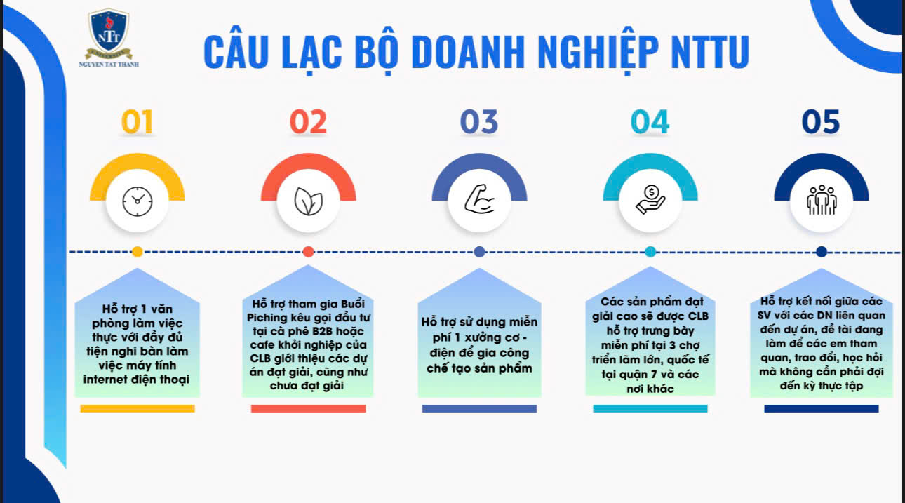 Với tinh thần “Sinh viên là trung tâm – Khởi nghiệp là động lực”, Câu lạc bộ Doanh nghiệp Trường Đại học Nguyễn Tất Thành tiếp tục khẳng định vai trò là cầu nối vững chắc giữa sinh viên và doanh nghiệp. Trong thời gian tới, CLB Doanh nghiệp cam kết mang đến 5 hỗ trợ thiết thực và đột phá nhằm tạo môi trường thuận lợi để sinh viên phát triển ý tưởng, hiện thực hóa dự án và mở rộng cơ hội nghề nghiệp.